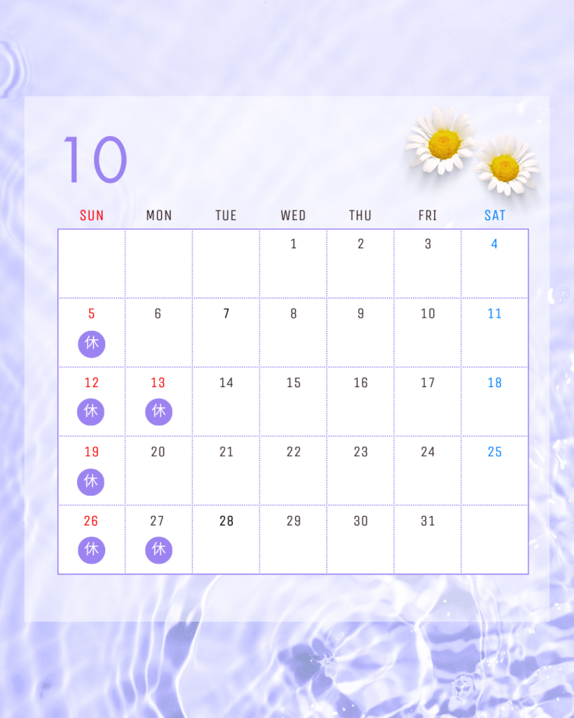 10月のカレンダーをお知らせいたします。
